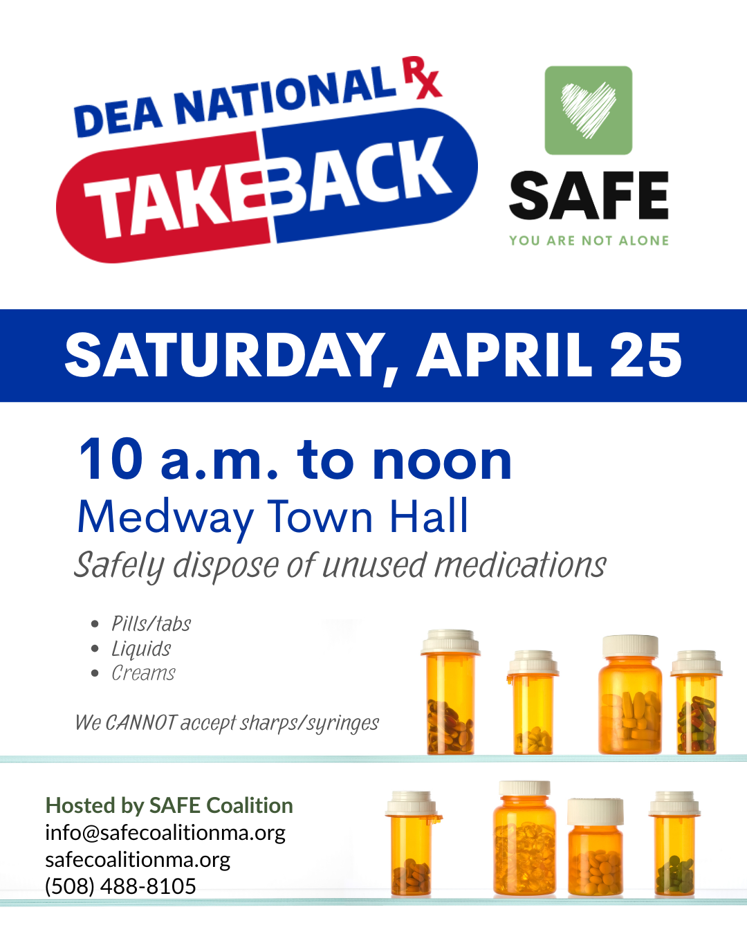 Drive in and drop off your unwanted medications. National DEA Medication Take Back Day is Saturday, April 25, 2026, from 10:00 am to noon. Stop by the parking lot at Medway Town Hall, 155 Village Street. We can take tabs/pills, lotions, patches, and liquids. Decrease substance access. Dispose of medications.