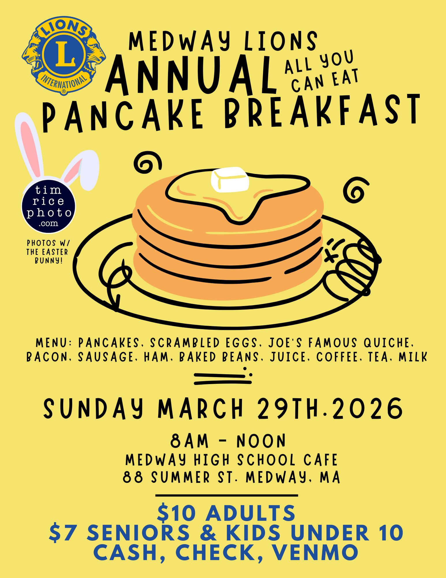 All-you-can-eat Pancake Breakfast with Medway Lions Club – 33K Mass! Pancakes, eggs, Joe’s Famous Quiche & more 😋 Plus photos with the Easter Bunny by Tim Rice Photo!