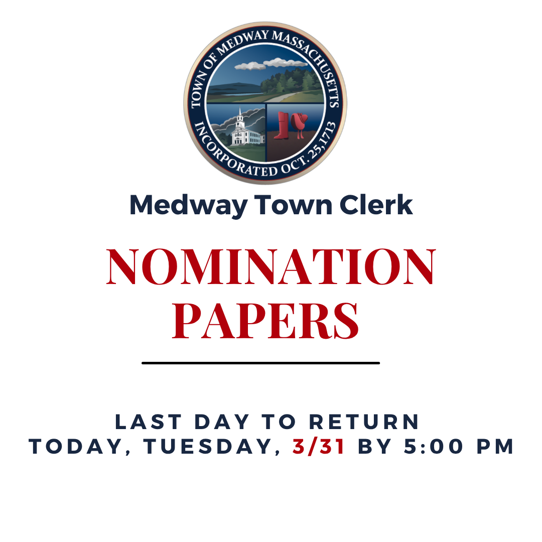 Important reminder from the Town Clerk’s Office: Nomination papers must be returned by 5:00 PM today, Tuesday, March 31, 2026, to be eligible for placement on the May Town Election ballot.