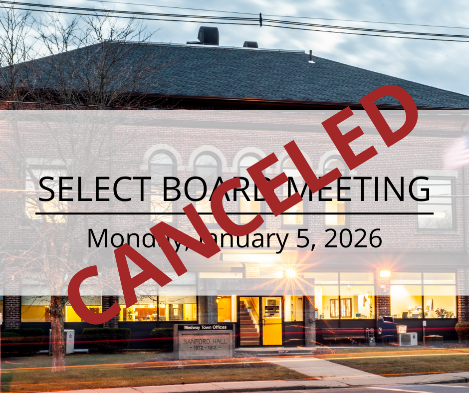 Please note that the Select Board meeting scheduled for January 5, 2026, has been canceled due to the lack of a quorum. The next Select Board meeting will be held on Tuesday, January 20, 2026.