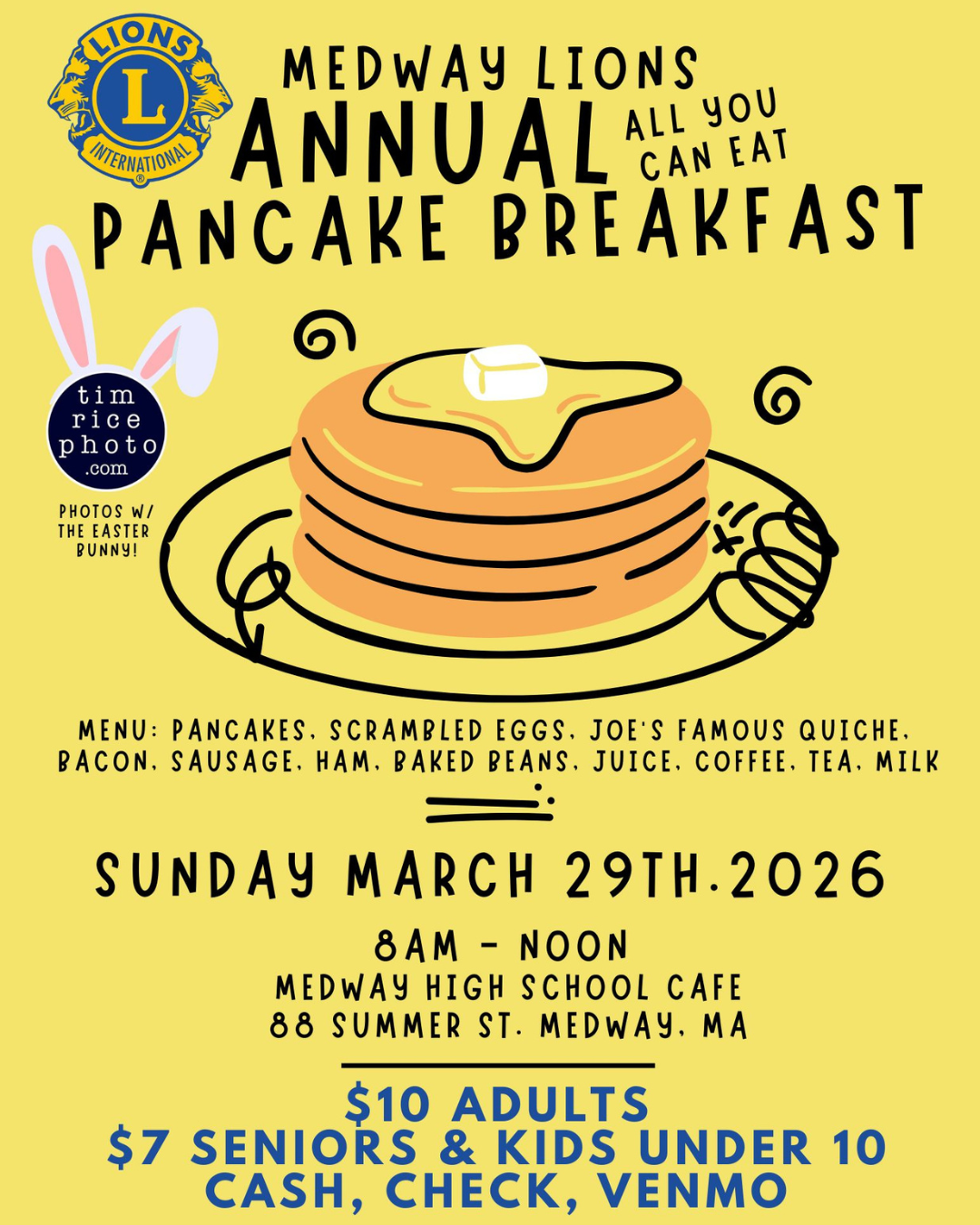 The Medway Lions Club Annual Pancake Breakfast is almost here! Join us at the Medway High School Café (88 Summer Street) for an all-you-can-eat breakfast with plenty of tasty options. Tim Rice Photo will be on site, and the Easter Bunny will be stopping by for photos!